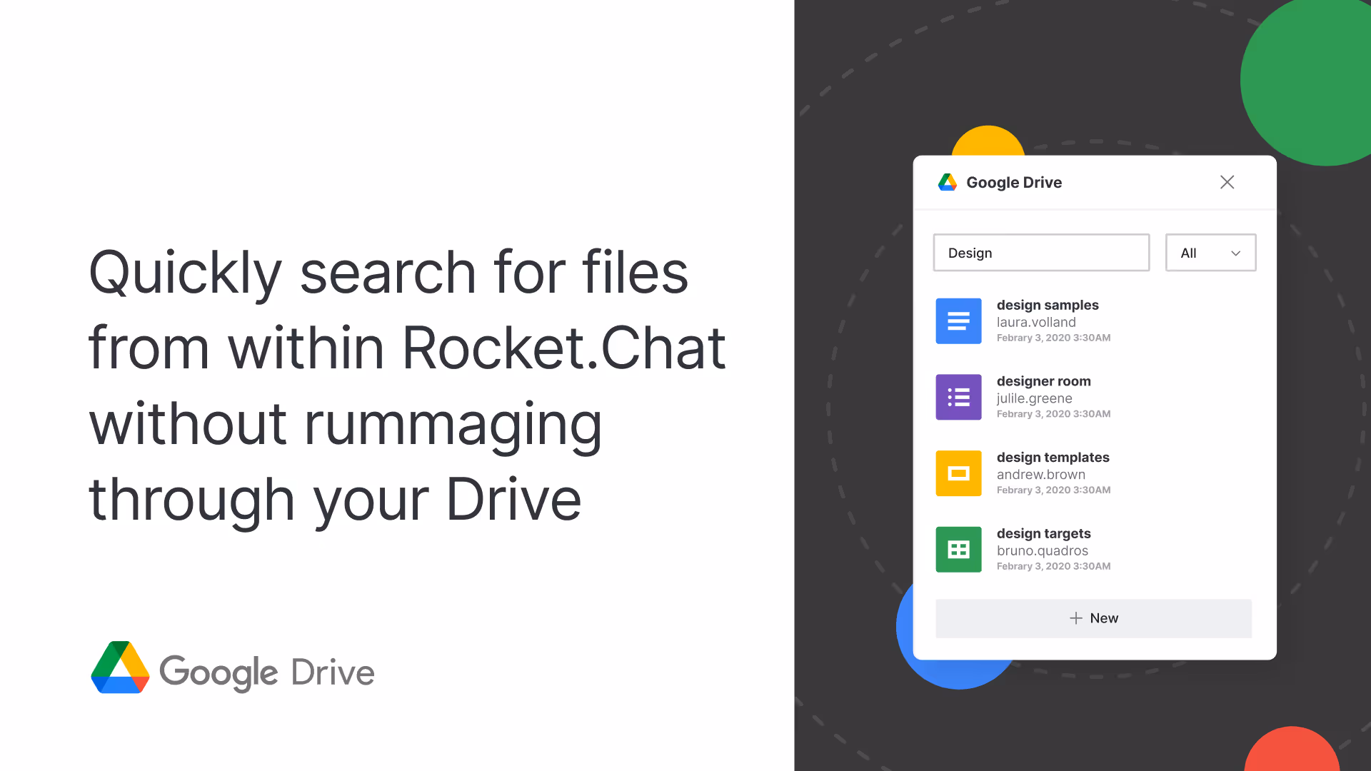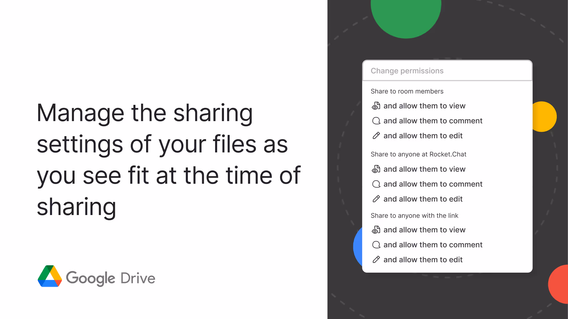 Em vista da crescente demanda por uma ferramenta de colaboração abrangente, essa integração é útil quando você deseja reunir seus arquivos, conversas e projetos em um só lugar. Integre o Google Drive ao Rocket.Chat para compartilhar arquivos do Drive em vários canais, salas e discussões em seu espaço de trabalho, sem trocar de ferramenta. A parte mais legal dessa integração é como é fácil gerenciar as permissões de compartilhamento de arquivos do Rocket.Chat, para que você possa determinar a acessibilidade dos arquivos compartilhados e definir restrições sobre as ações que os membros do espaço de trabalho podem executar.